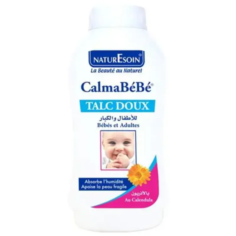 Le talc doux CalmaBébé de NaturEsoin est spécialement conçu pour le confort et la protection de la peau fragile des bébés. Sa formule douce et hypoallergénique offre une sensation de fraîcheur, de douceur et de protection contre les irritations et l’humidité.Le talc doux CalmaBébé de NaturEsoin est spécialement conçu pour le confort et la protection de la peau fragile des bébés. Sa formule douce et hypoallergénique offre une sensation de fraîcheur, de douceur et de protection contre les irritations et l’humidité.